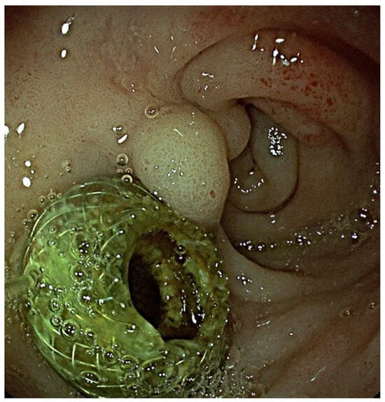 - Adler, D.G.; Baron, T.H. Endoscopic Palliation of Malignant Gastric Outlet Obstruction Using Self-Expanding Metal Stents: Experience in 36 Patients. Am. J. Gastroenterol. 2002, 97, 72–78. [Google Scholar] [CrossRef]