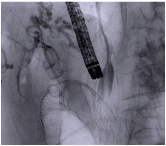 - Dumonceau, J.-M.; Tringali, A.; Papanikolaou, I.S.; Blero, D.; Mangiavillano, B.; Schmidt, A.; Vanbiervliet, G.; Costamagna, G.; Devière, J.; García-Cano, J.; et al. Endoscopic Biliary Stenting: Indications, Choice of Stents, and Results: European Society of Gastrointestinal Endoscopy (ESGE) Clinical Guideline—Updated October 2017. Endoscopy 2018, 50, 910–930. [Google Scholar] [CrossRef]
