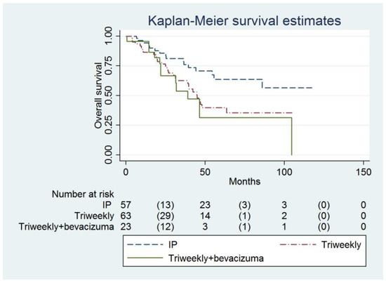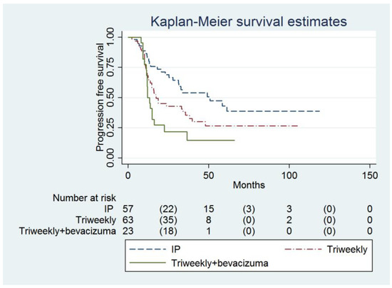 A total of 143 consecutive women who underwent debulking surgery and adjuvant intravenous/intraperitoneal chemotherapy with/without bevacizumab (IVB group, n = 23; IV group, n = 63; IP group, n = 57) were reviewed (Table 1). There were no significant differences in the baseline characteristics between the three groups of women except the baseline performance status (Table 1). Despite two physicians being preferred to perform IP chemotherapy compared to the other four physicians (correlation coefficient = 0.538, Table 1), there was no difference in the residual disease status between the IP-preferring physician group and the other physician group (i.e., the IP-preferring physician group vs. the other physician group: no residual—22 vs. 12, optimal—29 vs. 10, suboptimal—41 vs. 29, correlation coefficient = −0.075). Seven women underwent neoadjuvant chemotherapy. One woman had R0, two women had an <1 cm residual tumor and four women had an >1 cm residual tumor after interval debulking surgery.