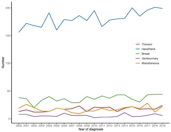 Among all patients, the head and neck area was the most common site (70.1%), followed by the breast (14.1%), while thoracic, genitourinary, and miscellaneous accounted for 6.8%, 2.2%, and 6.8%, respectively (Table 1 and Supplementary Table S2). The annual trend of different ACC tumor sites is shown in Figure 1, which shows that head and neck tumors had the highest annual incidence, followed by breast, while genitourinary tumors were the least.