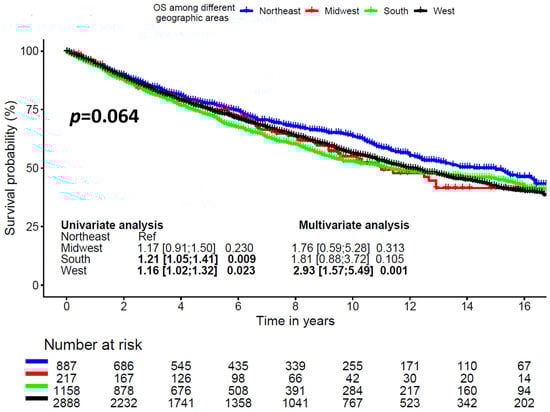 Six-year OS was 71.8% ± 3.5%, 74.4% ± 1.6%, 67.3% ± 1.5%, and 71% ± 0.9% for Midwest, Northeast, South, and West regions, respectively (p = 0.064, Figure 2).