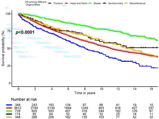 Six-year OS was 86.5% ± 1.4%, 75.3% ± 4.5%, 68.2% ± 0.9%, 60.5% ± 3.0%, and 73.8% ± 2.7% for breast, genitourinary, head and neck, thorax, and miscellaneous (skin, and others) cancer locations, respectively (p < 0.0001, Figure 3).