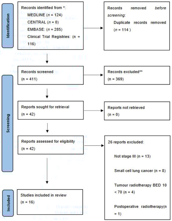 There were 124, 0, and 285 publications identified through MEDLINE, CENTRAL (Cochrane reviews or Cochrane protocols), and EMBASE databases, respectively, during the period from 1 January 1990 to 31 March 2024. After duplicates and irrelevant studies were removed, there were a total of 42 full-text articles assessed for eligibility. Twenty-six records were excluded, which left 16 studies for qualitative and quantitative synthesis (Figure 1).