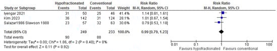 The 1 year overall survival results of the 3 phase III trials [31,32,33,34] comparing hypofractionated radiation therapy versus conventionally fractionated radiation therapy (60 Gy in 30 daily fractions) were pooled (Figure 2). Overall, there was no difference in overall survival with the use of hypofractionated radiation versus conventionally fractionated radiation (therapy RR 0.99 (95% confidence interval 0.79–1.23), p = 0.92). Using GRADE (16), the certainty of the evidence was moderate. It is noted, however, that the hypofractionated arms were different among the three trials: 60 Gy in 15 daily fractions [31], 60 Gy to GTV and 45 Gy to PTV in 25 daily fractions [32], and 60 Gy in 12 weekly fractions (5 Gy given once weekly [33,34]. In addition, 2 of the 3 trials did not allow concurrent chemotherapy [31,33,34]. The remaining trial [32] used concurrent weekly paclitaxel and cisplatin with the hypofractionated and conventional radiation arms.