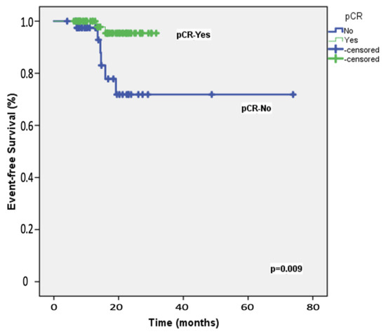 Event-free survival: Kaplan–Meier plot illustrating event-free survival in the 108 study patients, stratified by the achievement of pathologic complete response (pCR) following neoadjuvant therapy.