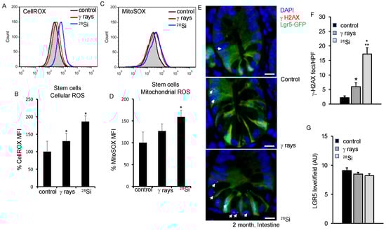 3.1. Assessment of ROS in Lgr5 Expressing ISCs after 28Si Irradiation in Mice