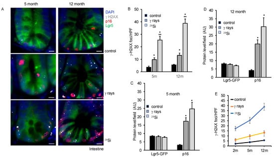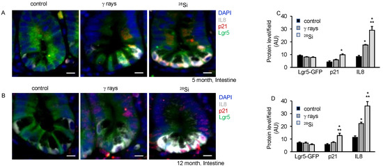Our earlier study using isolated ISCs from heavy-ion-irradiated mice demonstrated higher oxidative stress, DNA damage, senescence and SASP acquisition at 2 months post-exposure [16]. Here, we demonstrate the persistence of chronic stress marked by higher oxidative stress, DNA damage, senescence and acquisition of SASP chronic stress in ISCs of heavy-ion-irradiated mice up to 12 months post-irradiation. We assessed DNA double-strand break and senescence in the same section using γH2AX, p16, and Lgr5-GFP anti-antibodies in the co-staining experiment. We observed an increase in the average number of γH2AX foci in the irradiated groups compared to the control at 5 and 12 months post-irradiation (Figure 4A). An average number of γH2AX foci in 28Si were observed higher compared to γ-ray at 5 and 12 months post-irradiation. The results also indicated higher p16 staining after irradiation relative to the control group. The data show higher p16 staining in 28Si compared to γ-ray or the control group. Lgr5-GFP co-staining enables us to identify senescent ISCs containing DSB. The data showed a higher number of p16 positive nuclei with Lgr5-GFP staining and γH2AX foci in 28Si compared to γ-ray or control group suggesting a higher number of senescent ISCs with DSB in irradiated samples relative to the control (Figure 4A–D). We compiled the DSB data for 2-, 5- and 12-month samples and represented them graphically. The data demonstrated a significant increase in DSB with increasing LET as well as increasing time post-irradiation (Figure 4E). We further examined IL8, p21 and Lgr5-GFP expression at 5 m and 12 m post-irradiation, and found a higher level of IL8 as well as p21 expression in 28Si relative to the γ-ray or control irradiated samples (Figure 5A–D).