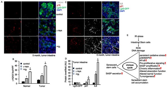 We also have previously demonstrated increased SASP and tumorigenesis in the Apc1638N/+ mice model after heavy-ion radiation [35]. Here, we wanted to detect the effect of 28Si ions in ISCs in normal and tumor tissue from the Lgr5+Apc1638N/+ mice model. Irradiated male Lgr5+Apc1638N/+ mice showed the highest tumor incidence in 28Si (7.83 ± 1.10, n = 9) relative to γ-ray (4.73 ± 0.27, n = 15) or control (2.88 ± 0.17, n = 15) group (Figure S1C). We found enhanced DNA damage and SASP in ISCs from 28Si relative to the γ-ray or control group, which confirms our earlier reports (Figure 7A–D). Both normal and tumor tissue were examined for γ-H2AX, p16, and Lgr5-GFP expression through immunostaining. The results show a higher number of γH2AX foci and enhanced p16 expression in the 28Si-irradiated group relative to the γ-ray or control group both in tumor or normal tissue (Figure 7B and Figure S2A). The level of p16 expression and γH2AX foci was significantly higher in tumors relative to normal tissue across the treatment groups (Figure 7B and Figure S2B). To further examine SASP acquisition, tissue sections were co-stained with IL8, p21, and Lgr5-GFP and analyzed under fluorescent microscopy. The data demonstrate increased IL8 and p21 expression after 28Si compared to the γ-ray or control group in normal as well as tumor tissue. These pieces of evidence suggest the greater acquisition of SASP in 28Si compared to the γ-ray or control group in the tumor as well as normal tissue (Figure 7C,D and Figure S3A,B), whereas a lower level of Lgr5-GFP expression was observed after irradiation in normal as well as in tumor tissue (Figure 7D, Figures S2B and S3B).