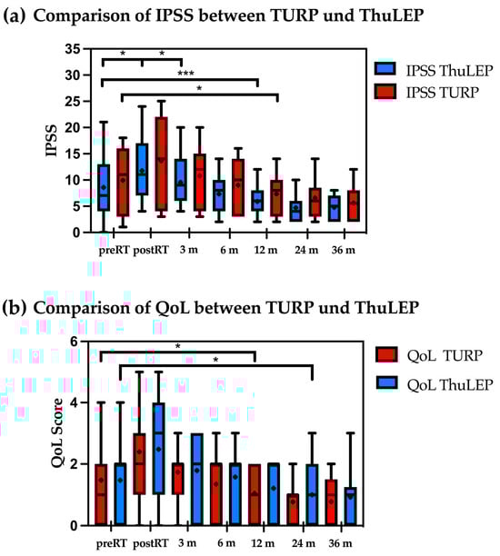 Patients who underwent previous TURP showed a significant IPSS increase immediately post-RT (p = 0.02), while patients with ThuLEP showed a trend but no significant increase (p = 0.07, Figure 1a). However, after 12 months, both groups showed a decrease in the IPSS compared to the baseline (for TURP: p = 0.002; from mean 8.6 to 5.9; for ThuLEP patients from 9.9 to 7.3, p = 0.01). IPSSs remained reduced for the rest of the available follow-up. With regard to the QoL score, patients with prior TURP showed a difference after 12 months post-RT compared to the initial value before RT (p = 0.02).