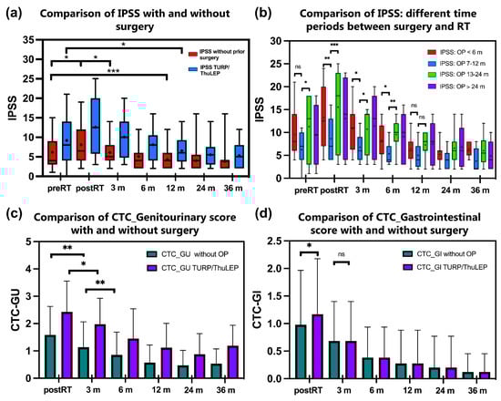 (a–d). Comparison of IPSS between patients who underwent TURP or ThuLEP before radiotherapy with patients without prior surgery (a). Figure 2b shows a subgroup analysis of patients who underwent surgery at different times before RT (b). Particularly, the subgroup of patients who underwent surgery between 6 and 12 months before radiotherapy shows a tendency of lower toxicity especially post-RT up to 6 months after RT compared to the other groups. Figure 2c,d show courses of patient-reported urinary toxicity (c) and gastrointestinal toxicity (d) measured with the Patient-Reported Outcome Common Terminology Criteria for Adverse Events. * p < 0.05; ** p < 0.01, *** p < 0.001, ns = not significant. The median is marked as a horizontal line and the mean is marked as +. Abbreviations: CTC-GU: Common Terminology Criteria for Adverse Events Genitourinary score; CTC-GI: Common Terminology Criteria for Adverse Events Gastrointestinal score; IPSS: International Prostate Syndrome Score; m: months; OP: operation; RT: radiotherapy; ThuLEP: thulium laser enucleation of the prostate; TURP: transurethral resection of the prostate.
