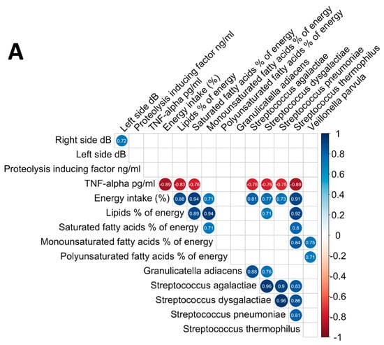 This study examined the relationships between oral microbiome variables, inflammatory parameters, dietary variables, and electrical taste perception outcomes using Pearson’s correlations. R Studio’s corrplot function [59] was used to express associations by correcting multiple tests with the false discovery rate (FDR) procedure [60]. The graphs show only significant and corrected associations. In the graphs, red and blue lines indicate the correlation values, with negative correlations highlighted in red (−1) and positive correlations highlighted in blue (+1). In this study, we examined only a subset of dietary variables (energy intake (%), lipids (%), saturated fatty acids (%), and monounsaturated fatty acids (%)) that were significantly correlated; a complete list of the dietary variables is available in our previous study [41].