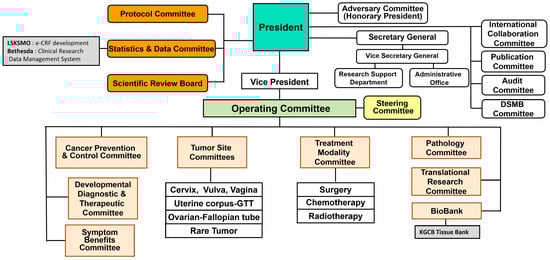 KGOG has expanded to its current structure over approximately 20 years, passing through the leadership of five presidents: Professor Soon-Beom Kang (2002–2010), Professor Joo-Hyun Nam (2010–2014), Professor Byung-Gie Kim (2014–2016), Professor Yong-Man Kim (2016–2021), and Professor Jae-Hoon Kim (2021–present). The current organizational chart of KGOG is shown in Figure 1. In 2024, KGOG consisted of 4 Tumor Site Committees (Cervix, Vulva, Vagina; Uterine Corpus-GTT; Ovary–Fallopian tube; Rare Tumor), 3 Treatment Modality Committees (Surgery; Chemotherapy; Radiotherapy), and 14 other committees (Advisory; Operating; Steering; Protocol; Statistics and Data; International Collaboration; Publication; Audit; DSMB; Cancer Prevention and Control; Developmental Diagnostic and Therapeutic; Symptom Benefits; Pathology; Translational Research), and 2 supportive departments (SRB and Biobank). The operating Committee reviews the progress of KGOG research every month, while the Steering Committee is an ad hoc committee that primarily handles financial and administrative matters.