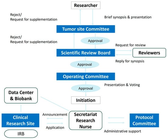 The researcher submits a summary-formatted research proposal to the Tumor Site Committee for initial review. If the study is deemed to have clinical value and is suitable for KGOG, the Tumor Site Committee chair submits the proposal to the Scientific Review Board (SRB) for a detailed secondary review. Comprising five internal and external reviewers plus one chair, the SRB assesses the rationality, feasibility, and ethical considerations of all clinical trials to be conducted by KGOG. Upon SRB approval, the principal investigator will present the proposal to the Operating Committee based on the discussions that took place within the Tumor Site Committee and SRB, and the Operating Committee attendees will discuss whether to proceed with the study. If more than two-thirds of attendees agree during the second review, the study is approved as a KGOG protocol. If not approved, decisions may include re-review, deferral, or rejection. Once the Protocol Committee approves the full protocol, the principal investigator drafts a research contract with KGOG and obtains a research number through the KGOG Secretariat to recruit participating institutions. The development process of new protocols is detailed in Figure 2.