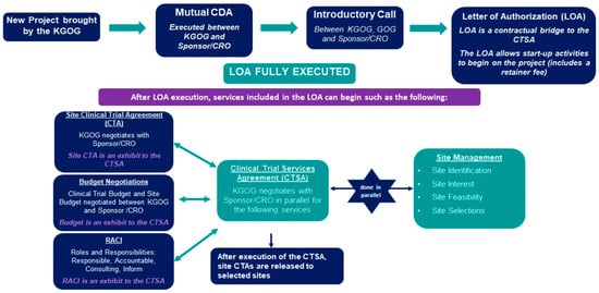 New study initiation process between GOG-P and KGOG. CDA: Confidential Disclosure Agreement; CRO: Contract Research Organization; CTSA: Clinical Trial Services Agreement; GOG: Gynecologic Oncology Group; KGOG: Korean Gynecologic Oncology Group; RACI: Responsible, Accountable, Consulting, Inform.