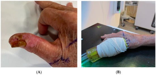 (A) Right thumb squamous cell carcinoma prior to radiation therapy. (B) Clinical setup utilizing custom surface mold applicators wrapped in elastic bandage.