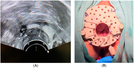 (A) Transrectal ultrasound visualization of rectal tumor after needle insertion. (B) Kelowna gynecologic template with transperineal needles in place.