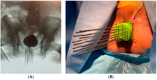 Brachytherapy Technique and Applicators: Image guidance during the procedure was performed using fluoroscopy (Figure 3A) rather than the standard TRUS approach. HDR BT was successfully performed in two sessions using 17 transperineal interstitial needles (Figure 3B), delivering a total of 2700 cGy.
