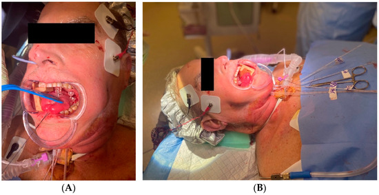 (A) Close-up view of oral cavity and interstitial applicators, illustrating submental approach. (B) Overall view of patient positioning during procedure, including prophylactic tracheostomy.