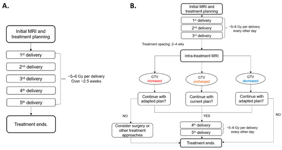 Comparison of workflows between (A) fractionated stereotactic radiotherapy (fSRT) and (B) PULSAR. PULSAR includes an intra-treatment MRI assessment to evaluate the change in GTV (increased, unchanged, or decreased), enabling more personalized treatment and timely adjustment.