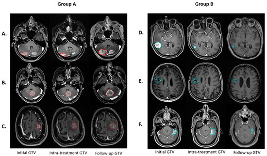 Six lesions illustrate the temporal evolution of GTV at various treatment stages. In Group A (lesions with red contours), three lesions exhibit non-decreased GTV at follow-up compared to the initial, but they display different GTV changes at the intra-treatment time point, with intra-treatment assessments of (A) decreased, (B) unchanged, and (C) increased GTV. In contrast, Group B (lesions with blue contours) depicts three lesions with a decreased GTV at follow-up compared to the initial, with intra-treatment variations categorized as (D) decreased, (E) unchanged, and (F) increased GTV.