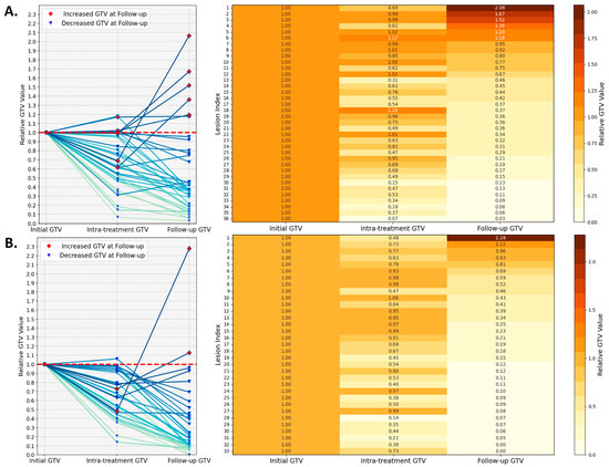 Lesion volumetric changes examined at three time points (pre-treatment, intra-treatment, and follow-up) for two subsets, namely lesions smaller than 4000 mm3 (A) and those larger than 4000 mm3 (B). The line graphs on the left display the relative GTV changes for each lesion during PULSAR. The accompanying heatmaps on the right provide a detailed quantitative representation of these changes, with color intensity reflecting the relative increase or decrease in tumor volume.