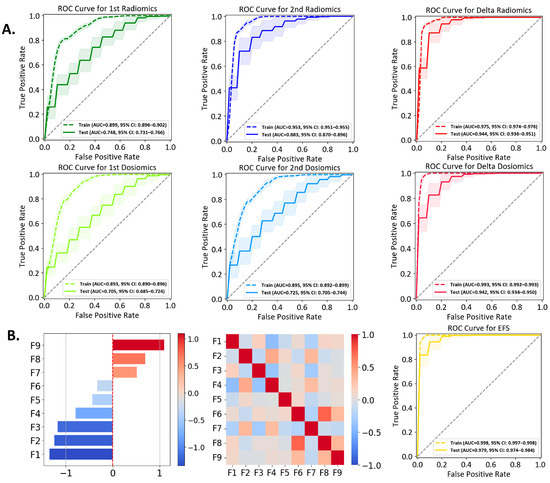 The EFS model comprises nine features identified from a pool of features originating from four scenarios (first radiomics, second radiomics, delta radiomics, and first dosiomics). The correlation heatmap of these nine features, shown in Figure 4B, demonstrates minimal inter-feature correlation. Detailed descriptions (e.g., names, types, weights in the SVM) are summarized in Table 4, where the weight coefficients (in a descending order) reflect their respective influence along with the z-score. The ROC curve of the EFS model is depicted in Figure 4B, exhibiting an AUC of 0.979, sensitivity (0.907), specificity (0.920), accuracy (0.917), precision (0.786), and F1 score (0.821). While the EFS model has a sensitivity comparable to that of the delta radiomics model, the EFS model achieves superior performance in all other metrics (Table 2). The ROC comparison of different models, as well as one example of the confusion matrices from a single iteration of the fivefold cross-validation, are provided in Figures S1 and S3, respectively.