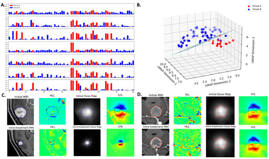 (A) Probability scores for lesions obtained across different models. The horizontal axis represents the lesion index, and the vertical axis represents the probability score of a lesion under different models. The models (from top to bottom) are 1st radiomics, 2nd radiomics, delta radiomics, 1st dosiomics, 2nd dosiomics, delta dosiomics, and the EFS model. The EFS model shows the most effective separation between the two groups. (B) UMAP visualization of the EFS model’s nine features, projected into a three-dimensional space to illustrate the separation between Group A and Group B lesions. An SVM hyperplane serves as the decision boundary between the groups. (C) A lesion (contour in blue) with decreased GTV at follow-up compared to the initial. (D) A lesion (contour in red) with non-decreased GTV at follow-up compared to the initial. Panels include initial MRI, intra-treatment MRI, initial dose map, intra-treatment dose map, and wavelet-transformed images.