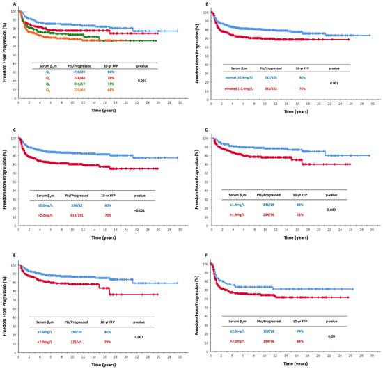 (A) Freedom from progression (FFP) according to sβ2m levels classified as quartiles in the whole patient population; (B) FFP according to sβ2m levels as “normal vs. elevated” in the whole patient population (≤2.4 mg/L vs. >2.4 mg/L); (C) FFP according to sβ2m levels (≤2.0 mg/L vs. >2.0 mg/L) in the whole patient population; (D) FFP according to sβ2m levels (≤1.9 mg/L vs. >1.9 mg/L) in early-stage patients; (E) FFP according to sβ2m levels (≤2.0 mg/L vs. >2.0 mg/L) in early-stage patients; and (F) FFP according to sβ2m levels (≤2.0 mg/L vs. >2.0 mg/L)in advanced-stage patients.