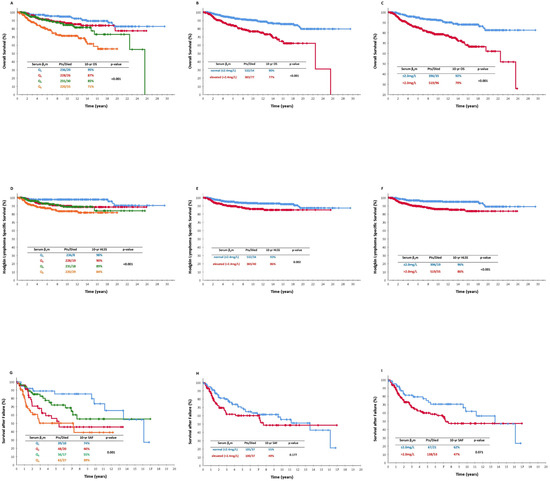 (A) Overall survival (OS) according to sβ2m levels classified as quartiles in the whole patient population; (B) OS according to sβ2m levels as “normal vs. elevated” in the whole patient population (≤2.4 mg/L vs. >2.4 mg/L); (C) OS according to sβ2m levels (≤2.0 mg/L vs. >2.0 mg/L) in the whole patient population; (D) Hodgkin lymphoma-specific survival (HLSS) according to sβ2m levels classified as quartiles in the whole patient population; (E) HLSS according to sβ2m levels as “normal vs. elevated” in the whole patient population (≤2.4 mg/L vs. >2.4 mg/L); (F) HLSS according to sβ2m levels (≤2.0 mg/L vs. >2.0 mg/L) in the whole patient population; (G) survival after failure (SAF) according to sβ2m levels classified as quartiles in the whole patient population; (H) SAF according to sβ2m levels as “normal vs. elevated” in the whole patient population (≤2.4 mg/L vs. >2.4 mg/L); and (I) SAF according to sβ2m levels (≤2.0 mg/L vs. 2.0 mg/L) in the whole patient population.