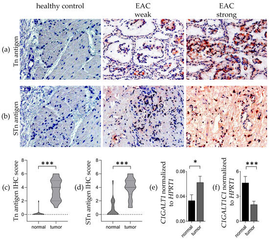 Truncated O-glycans Tn and STn antigens are highly expressed in EAC. (a,b) Representative microscopic images at ×100 magnification featuring immunohistochemical staining with monoclonal antibodies targeting Tn or STn antigens on sections of EAC (weak and strong) or healthy esophageal tissue. (c,d) Sores of Tn and STn antigen IHC staining reflecting antibody binding in normal and EAC tissue. (e) Analysis and quantification of T-Synthase (C1GALT1) mRNA and (f) COSMC (C1GALT1C1) expression levels in healthy and EAC tissues. * equals p ≤ 0.05 and *** equals p ≤ 0.001.