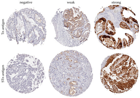 For CRC, minimal intracellular Tn staining was observed in normal mucosa, while a significantly higher expression was noted in both peritumoral mucosa and adenocarcinoma. This staining pattern was reflected to a lesser extent by STn expression in these tissue types [45].