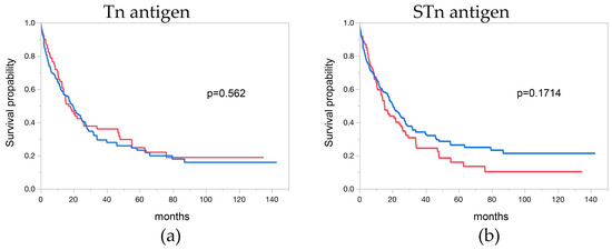 Follow-up data were accessible for 311 and 353 EAC patients with informative Tn and STn antigen data, respectively. Notably, Tn and STn antigen immunostaining exhibited no significant association with the overall survival of EAC patients (p = 0.562 and p = 0.171). The correlation between Tn and STn antigen immunostaining and the clinical outcome of the patients is depicted in Figure 3a,b.
