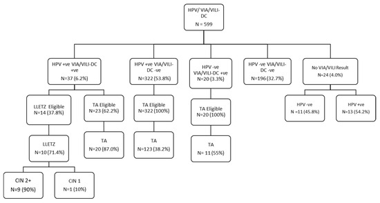 Project algorithm. CIN = cervical intraepithelial neoplasm; HPV = human papillomavirus; VIA/VILI-DC = visual inspection with acetic acid/visual inspection with Lugol’s iodine-digital cervicography; LLETZ = large loop excision of the transformation zone; TA = thermal ablation; −ve = negative; +ve = positive.