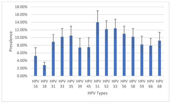 Among the 599 records, a total of 62.1% (95%CI: 58.2–66.0%) (Table 1) were positive for one or more HPV types. All 15 HPV types detected using the AmpFire technology were present in this population. Among the 15 HPV types, type 51 had the highest prevalence of 14%, followed by type 53 (12.4%) and type 52 (12.2%). Type 18 had the lowest prevalence of 2.8% followed by type 16 with 5.2% (Figure 2).