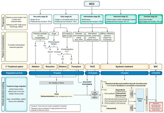 - Reig, M.; Forner, A.; Rimola, J.; Ferrer-Fàbrega, J.; Burrel, M.; Garcia-Criado, Á.; Kelley, R.K.; Galle, P.R.; Mazzaferro, V.; Salem, R.; et al. BCLC Strategy for Prognosis Prediction and Treatment Recommendation: The 2022 Update. J. Hepatol. 2022, 76, 681–693. [Google Scholar] [CrossRef]