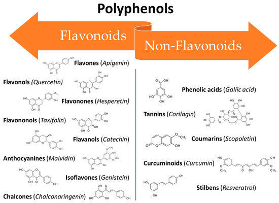 The large class of polyphenols comprise a broad group of phytochemicals that includes hundreds of natural molecules which are divided into different subclasses according to their main chemical structure. These compounds range from small molecules such as phenolic acids or stilbenes to larger molecules such as tannins [39]. The chemical characteristic that units all of the polyphenols are a phenolic structure based on phenyl ring(s) as a core which presents one or more hydroxyl substituents, essential for the radical scavenging activity (due to electron delocalization and stabilization of the formed radical) [37]. According to their structure polyphenols can be classified into two main groups: flavonoids and non-flavonoids (Figure 1). Flavonoids possess two phenyl rings fused with a central heterocyclic ring containing oxygen [40]. They can be further subdivided into flavonols, flavones, flavanones, flavanols isoflavones, anthocyanidins, and chalcones.