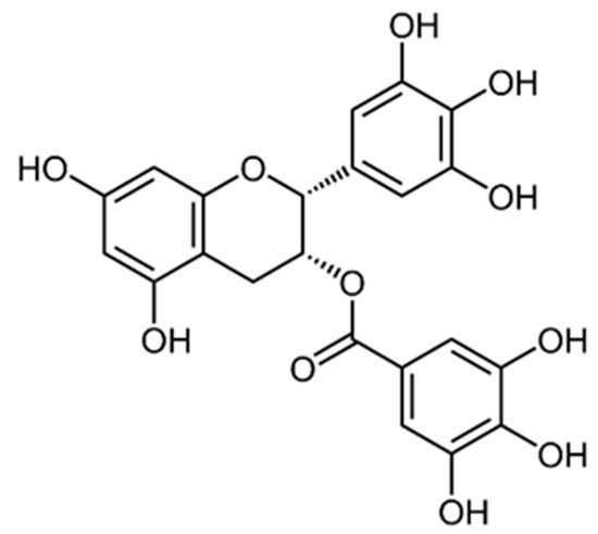 Chemical structure of Epigallocatechin gallate (EGCG; (2R,3R)-3′,4′,5,5′,7-Pentahydroxyflavan-3-yl 3,4,5-trihydroxybenzoate).