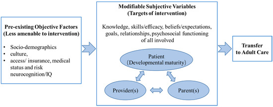 - Morsa, M.; Gagnayre, R.; Deccache, C.; Lombrail, P. Factors influencing the transition from pediatric to adult care: A scoping review of the literature to conceptualize a relevant education program. Patient Educ. Couns. 2017, 100, 1796–1806. [Google Scholar] [CrossRef] [PubMed]