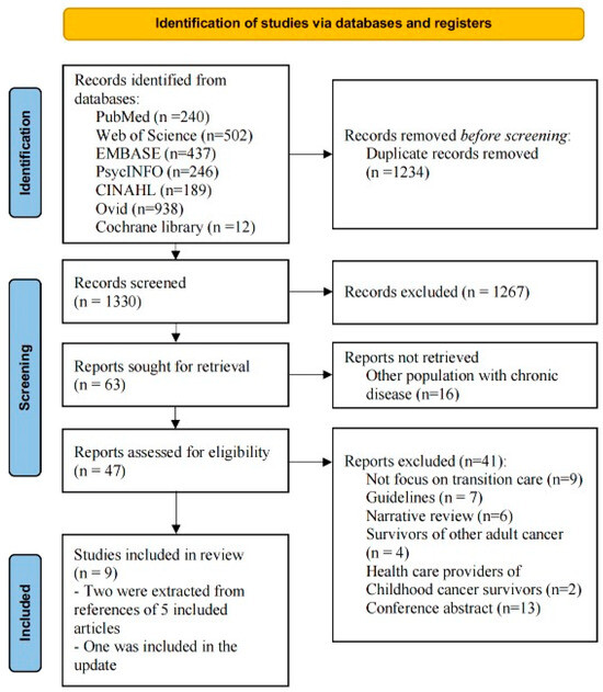 The comprehensive literature searches were conducted in PubMed, Web of Science, EMBASE, PsycINFO, CINAHL, Ovid, and Cochrane Library, covering the years from January 2005 to October 2022 and updated on 16 January 2023. This starting date coincided with the publication of the seminal Institute of Medicine report in 2005 called “From Cancer Patient to Cancer Survivor: Lost in Transition,” which highlighted cancer survivors and the concept of transition [7,10].