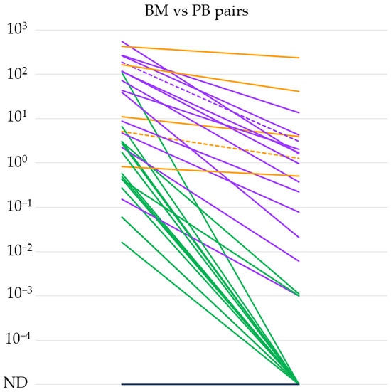 IGH::NSD2 fusion transcript expression levels of bone marrow (BM) and peripheral blood (PB) sample pairs (n = 34). The orange lines indicate differences of less than 1, the purple lines between 1 and 3, and the green lines of more than 3 orders of magnitude. Extramedullary MM cases are marked with dashed lines. ND = not detectable.