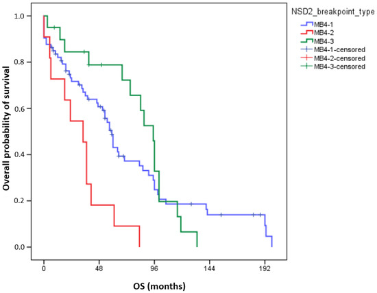 The literature lacks consensus regarding the survival outcomes of patients with various NSD2 breakpoints. Our data align with findings suggesting that patients with the MB4-2 breakpoint type exhibit adverse overall survival.