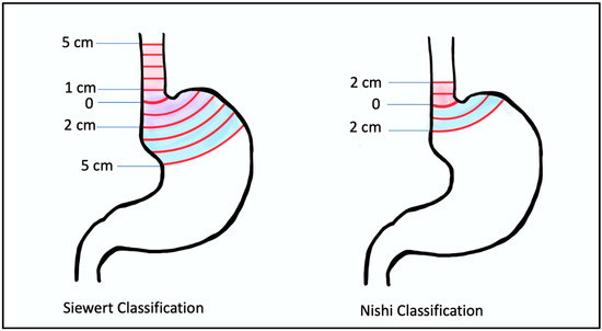 While US surgeons fairly uniformly use the Angle of His in concordance with the Siewert classification, there are differences among other specialties in how the GE junction is defined. Gastroenterologists use endoscopic visualization of the proximal extent of the longitudinal gastric folds (different from the squamocolumnar junction or z-line, which lies 3–10 mm proximal to this), and pathologists define it as the most proximal aspect of the gastric folds in an opened surgical specimen. There is no reliable radiographic definition of the GE junction. Additionally, it is important to note that the location of the GE junction may be affected by factors like diaphragmatic movement with respiration, which can cause inter-observer differences, the presence of Barrett’s esophagus, and hiatal hernias, which may change the location of the GE junction [12,13]. Other countries may not use the Siewert system at all. For example, Japan uses the Nishi classification system, which defines GE junction tumors as 2 cm above and below the GE junction (Figure 1).