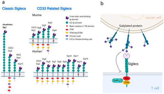 Siglecs are a group of receptors expressed on the membrane of leukocytes. Additionally, Siglecs belong to the I-type lectin family of the immunoglobulin superfamily and can recognize and bind to sialic acids on glycoproteins and glycolipids. In humans, 14 distinct Siglecs have been identified, which can be classified into the following two primary subfamilies: the conserved group and the rapidly evolving CD33-related group (Figure 1a) [9].