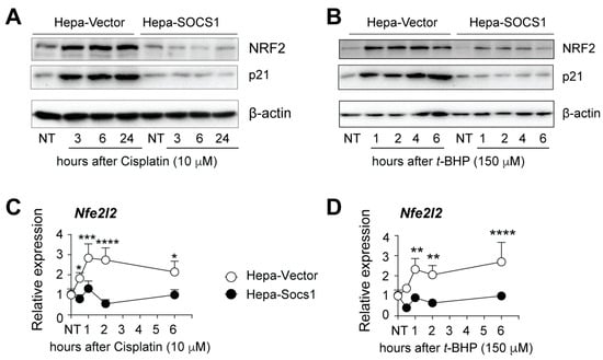 To study the impact of SOCS1 expression on antioxidant responses in HCC cells, we treated the murine Hepa1-6 (Hepa) hepatoma cell line stably expressing SOCS1 (Hepa-SOCS1) or the empty vector (Hepa-Vector) with cisplatin or t-BHP, which are known to induce oxidative stress [44,45,46,47,48,49,50,51,52,53]. Cisplatin increases mitochondrial ROS production, whereas t-BHP depletes antioxidant defense systems and also reduces mitochondrial membrane potential. Exposure to cisplatin markedly induced NRF2 protein expression in Hepa-Vector cells within 3 h after treatment, and this continued to remain elevated for up to 24 h (Figure 1A). Similarly, t-BHP treatment upregulated NRF2 protein expression within 1 h, which lasted for at least 6 h in Hepa-Vector cells (Figure 1B). On the other hand, NRF2 upregulation by both cisplatin and t-BHP was markedly attenuated in Hepa-SOCS1 cells (Figure 1A,B). The increase in NRF2 expression in Hepa-Vector cells following cisplatin or t-BHP treatment coincided with a marked upregulation of p21 protein expression, which was also abolished by stable SOCS1 expression (Figure 1A,B). The SOCS1-mediated attenuation of NRF2 and p21 protein expression also occurred in human Hep3B hepatoma cells expressing SOCS1 (Hep3B-SOCS1) exposed to t-BHP (Supplementary Figure S1A). Consistent with the fact that NRF2 induces its own transcription [54,55], exposure to cisplatin or t-BHP caused a rapid two- to four-fold increase in the expression of the Nfe2l2 gene within 1 h after drug treatment, which remained elevated for up to 6 h in Hepa-vector cells, whereas Hepa-SOCS1 cells did not show an appreciable induction of the Nfe2l2 gene (Figure 1C,D). These data indicate that SOCS1 is a key regulator of NRF2 protein expression and its transcriptional activation in hepatoma cells exposed to oxidative stress.