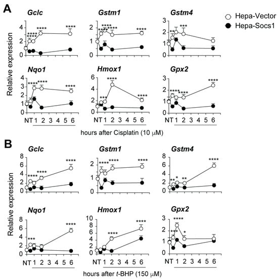 SOCS1 inhibits the induction of NRF2 target genes following oxidative stress. Hepa-Vector and Hepa-SOCS1 cells treated with cisplatin (10 μM; (A)) or t-BHP (150 μM; (B)) for the indicated periods of time and the expression of the indicated NRF2 target genes were evaluated by RT-qPCR. Cumulative data from four separate experiments are shown as mean ± SE. ANOVA with Tukey’s multiple comparison test. p values: * <0.05, ** <0.01, *** <0.001, **** <0.001.
