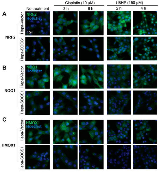 The evaluation of the expression of NRF2 by immunofluorescence revealed a more potent induction in t-BHP-treated Hepa-Vector cells than in cisplatin-treated cells (Figure 3A), consistent with the increase in Nfe2l2 transcript levels (Figure 1C,D). Notably, NRF2 localized to the nucleus at 6 h and 4 h after cisplatin or t-BHP treatment, respectively (Figure 3A). NRF2 protein expression was barely detectable in cisplatin-treated Hepa-SOCS1 cells, which showed a few cells with nuclear NRF2 after t-BHP treatment for 6 h (Figure 3A). Compared to NRF2, NQO1 and HMOX1 (HO-1) proteins showed higher levels of basal expression and were strongly induced by cisplatin in Hepa-Vector cells (Figure 3B,C). The protein levels of NQO1 and HMOX1 were not appreciably increased at 4 h after t-BHP treatment, consistent with the observation that Nqo1 and Hmox1 gene induction in Hepa-Vector cells peaked only at 6 h (Figure 2B and Figure 3B,C). The protein expressions of NRF2, NQO1 and HMOX1 at the basal level and in cisplatin- or t-BHP-treated Hepa-SOCS1 cells remained low (Figure 3A–C). On the other hand, both agents induced SOCS3 protein expression to a comparable extent in Hepa-Vector and Hepa-SOCS1 cells (Supplementary Figure S2), indicating that stable SOCS1 expression specifically impacts proteins involved in oxidative stress response.