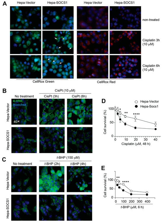 SOCS1 increases oxidative stress and reduces cell survival without increasing lipid peroxidation. (A,B) Hepa-Vector and Hepa-SOCS1 cells grown on glass covers were treated with cisplatin (10 μM) for the indicated periods of time. Oxidative stress was evaluated by CellRox staining. Mitochondrial CellRox Green staining is indicated by arrows. (B,C) Hepa-Vector and Hepa-SOCS1 cells were treated with cisplatin (10 μM) or t-BHP (150 μM) for the indicated periods of time. Lipid peroxidation was evaluated by 4-HNE immunostaining with DAPI staining of nuclei. (D,E) Hepa-Vector and Hepa-SOCS1 were treated with the indicated concentrations of cisplatin for 48 h or t-BHP for 6 h and cell survival was evaluated by the WST-8 assay. For (A–C), representative data from two experiments are shown. For (D,E), pooled data from three experiments are shown. Mean ± SE; Two-way ANOVA with Tukey’s multiple comparison test; * p < 0.05, ** p < 0.01, **** p < 0.0001.