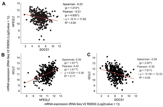 High SOCS1 gene expression in HCC correlates with low NFE2L2 and GCLC gene expression in the TCGA-LIHC transcriptomic data. Correlations between the expression of SOCS1 and NFE2L2 (A), NFE2L2 and GCLC (B) and SOCS1 and GCLC (C) genes in the TCGA-LIHC transcriptomic data were analyzed using the cBioportal platform. Correlation coefficient, significance values and slope are indicated.