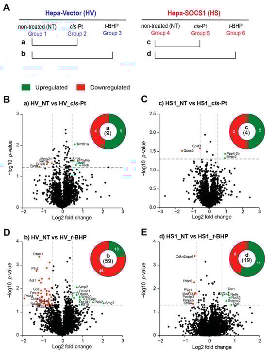 Impact of oxidative stress on the total proteome of Hepa cells. (A) Vector and Hepa-SOCS1 cells grown in 100 mm Petri dishes were treated with cisplatin (10 μM) or t-BHP (150 μM) for 3 h or left untreated. Proteins extracted from three different cultures (biological replicates) were subjected to shotgun proteomic analysis, and their proteomic profiles were compared as indicated (a, b, c, d). (B–E) Volcano plots showing significantly modulated proteins in Hepa-Vector cells treated with cisplatin (B) or t-BHP (C) compared to non-treated cells, and in Hepa-SOCS1 cells treated with treated with cisplatin (D) or t-BHP (E) compared to non-treated cells. Upregulated and downregulated proteins are indicated in green and red color dots, respectively. Pie charts indicate the total number of modulated proteins within the parenthesis in the center and the numbers of upregulated and downmodulated proteins with the green and red segments, respectively.