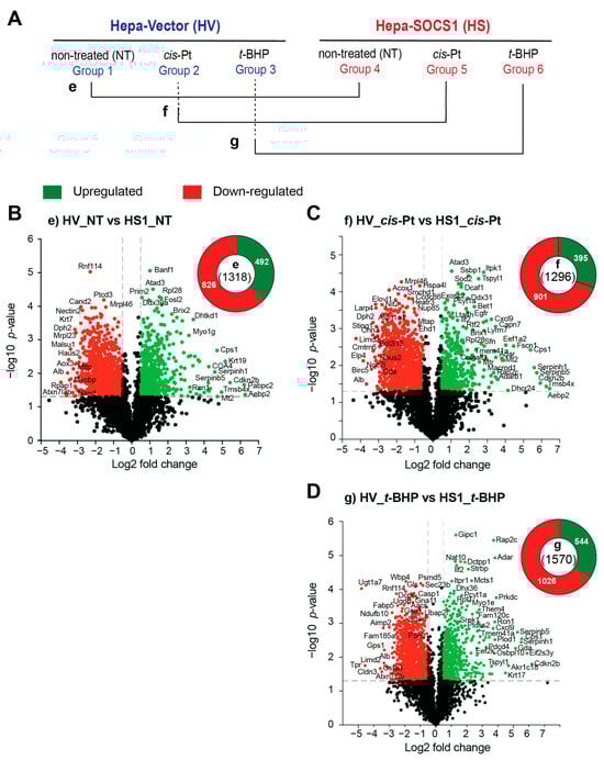 SOCS1 causes profound changes to the proteome of hepatoma cells. (A) The proteomic profiles of untreated and cisplatin-treated or t-BHP-treated Hepa-SOCS1 cells were compared to those of Hepa-Vector cells, as indicated (e, f, g). (B–D) Volcano plots showing significantly modulated proteins in untreated (B), cisplatin treated (C) and t-BHP treated (D) Hepa-SOCS1 cells compared to respective Hepa-Vector cells. Upregulated and downregulated proteins are indicated in green and red color dots, respectively. Pie charts indicate the total number of modulated proteins within parenthesis in the center and the numbers of upregulated and downmodulated proteins with the green and red segments, respectively.